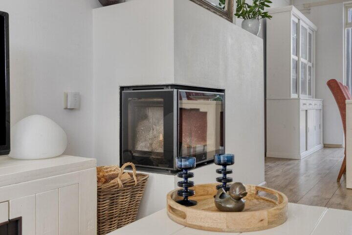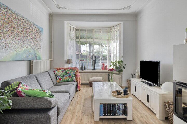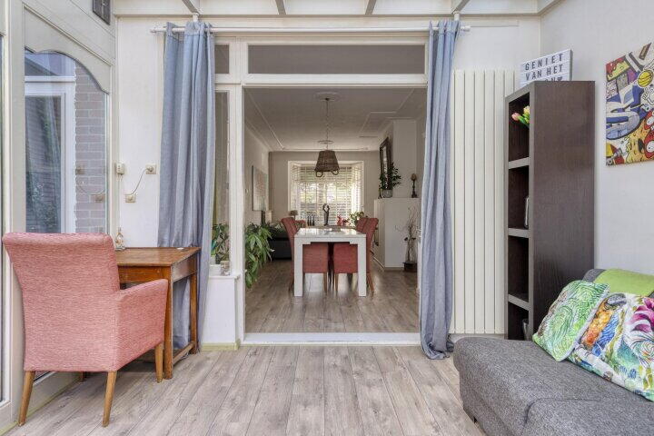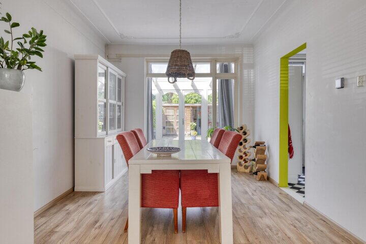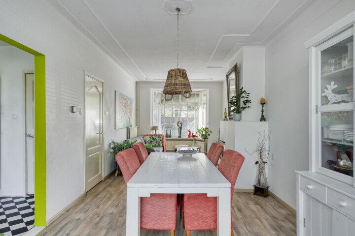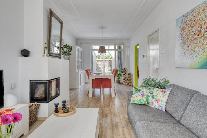 De woonkamer voelt ruim en uitnodigend aan, met een mooie lichte vloer, een klassieke erker die veel daglicht binnenlaat en een gezellige sfeerhaard als middelpunt. Vanuit de woonkamer loop je door naar de eetkamer, met zicht op de tuin en de serre, dé plek voor lange avonden tafelen. De keuken is praktisch en modern, met witte kastjes, een donkergrijs blad, inbouwapparatuur en de karakteristieke tegelvloer die terugkomt uit de hal.