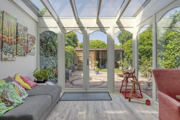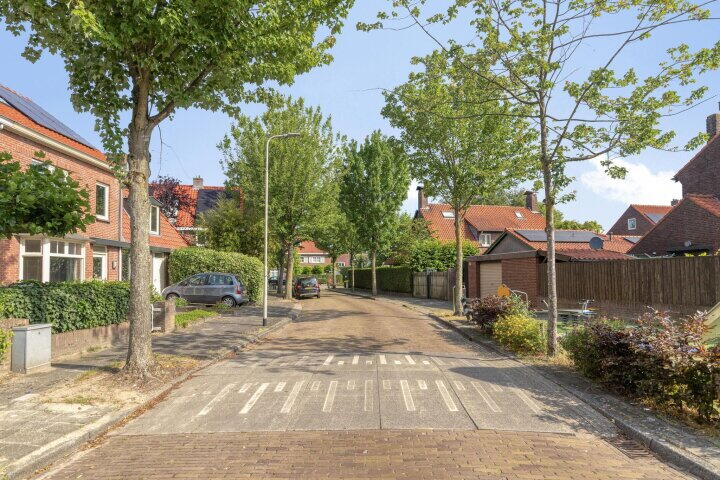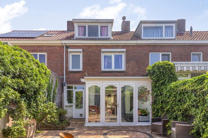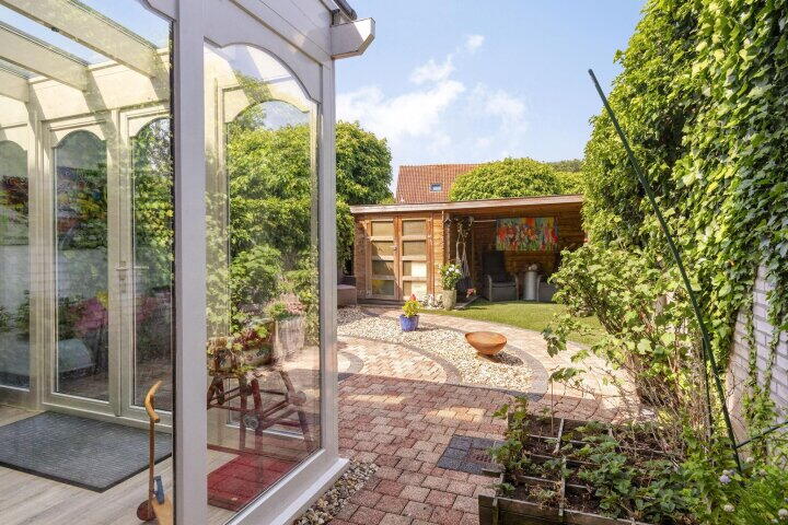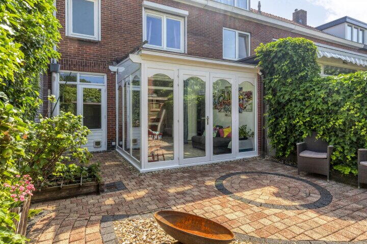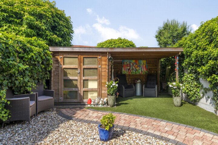 De achtertuin is keurig aangelegd met een combinatie van betegeling en gras. Achterin vind je een fijne overkapping met bergingsruimte, perfect voor ontspannen in de schaduw of het opbergen van tuingerei. En dan is er nog de serre! Een sfeervolle uitbouw waar je het hele jaar door kunt genieten van het buitengevoel met het comfort van binnen.